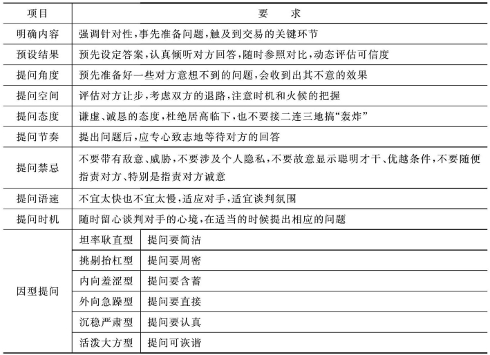 爱因斯坦曾经说过:“提出一个问题比解决一个问题更重要!”提问是指在谈判过程中,谈判者为刺激、引导信息交流,通过语言表达,要求对方给予相应信息的过程。提问是一个神奇的工具。在谈判中,通过提问,可以帮助谈判者获得自己需要知道的信息,获得需要了解的资料;可以摸清对方的真实意图、掌握对方心理变化;可以引起对方的注意、引导对方的思路;可以传达己方的意见、观点;也可以达到影响,甚至控制谈判进行方向的目的。