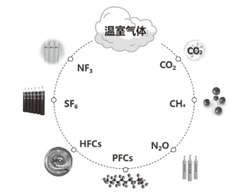 《京都议定书》规定的有二氧化碳(CO2)、甲烷(CH4)、氧化亚氮(N2O)、氢氟碳化物(HFCs)、全氟化碳(PFCs)和六氟化硫(SF6)。《京都议定书多哈修正案》将三氟化氮(NF3)纳入管控范围,使受管控的温室气体达到7种。我们常说的低碳、碳减排等术语中的碳,是二氧化碳的简称,实际上指的是温室气体。因为温室气体种类很多,各种温室气体对气候变化的影响不同,为便于比较,采用二氧化碳对气候的影响为基准,根据各种温室气体对气候变化的影响大小折算成当量的二氧化碳(即二氧化碳当量)。