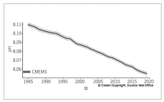 空气中的CO2溶于海水后形成碳酸,使海水的pH值下降,出现海洋酸化的现象,使其吸收大气中CO2的能力降低,削弱了海洋减缓气候变化的能力。在过去40年里,海洋每年吸收约23%人为排放到大气中的CO2,全球公海表面的pH值一直在下降(图1-10)。北极是全球对气候变化最敏感的地区,也是海洋酸化最严重的地区。过去20年来,西北冰洋出现大范围的酸化水体并以每年1.5%的速率增长,比太平洋或者大西洋所观测到的结果要快2倍以上,预测到21世纪中叶酸化水体将覆盖整个北冰洋。