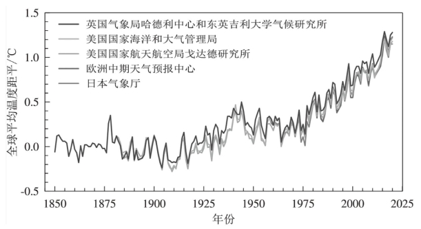 图1-8 1850—2020年全球平均温度距平(相对于1850—1900年平均值)
