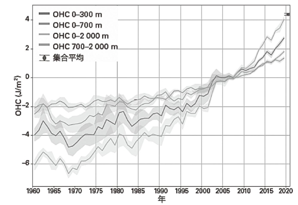 热能在地球内部积聚,构成了地球内动力的能量基础。海洋储存了大量被温室气体捕获的多余热量。海洋热含量(Oceanic Heat Content,OHC)可作为地球系统中这种热量累积的量度。2019年,全球海洋0~2000米深度层持续升温,海洋热含量为有记录以来最高水平,2020年延续了这一趋势(图1-9)。过去十年海洋变暖速度高于长期平均水平,这表明海洋在不断吸收温室气体捕获的热量,使海洋升温,导致海水热膨胀加剧海平面上升。