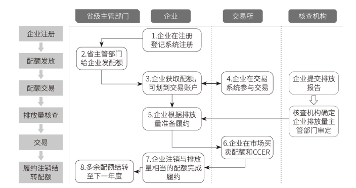 碳排放权交易的基本流程包括碳排放配额分配、温室气体排放报告、排放核查、配额交易和履约清算等5个环节(见图2-3)。