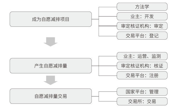 与核证自愿减排量不同的是,自愿减排项目和自愿减排量无需经国家主管部门登记备案,可以选择行业指定或买卖双方均认可的交易平台进行登记、注册、交易、核销等流程。自愿减排量产生和交易流程如图2—5所示。