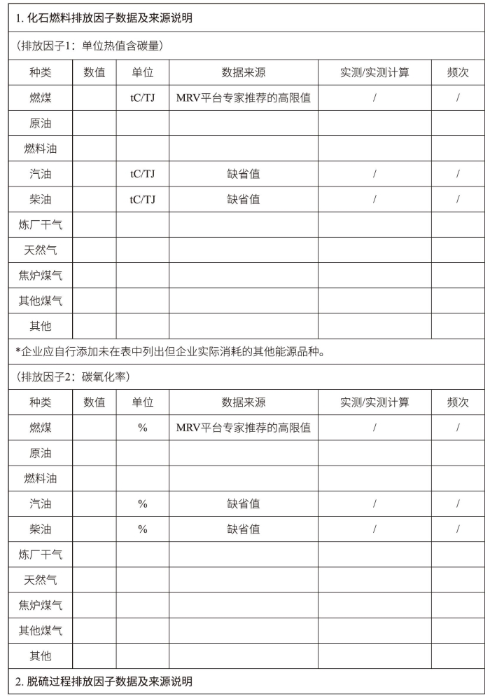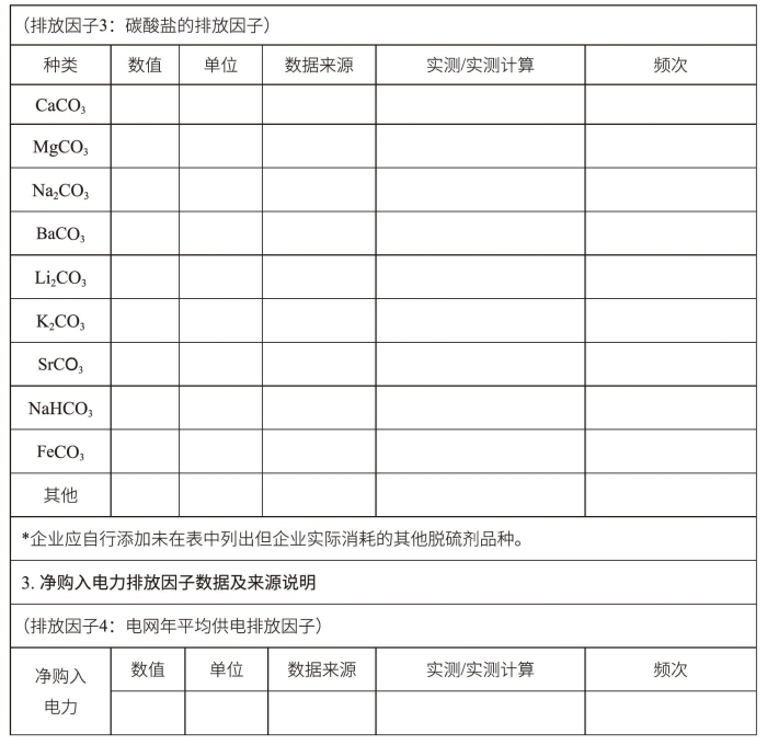 报告主体应分别报告各项活动水平数据所对应的含碳量或其他排放因子计算参数。如采用实测则应介绍监测计划执行情况,否则需说明其数据来源、参考出处、相关假设及其理由等。报告表格如表3-6所示。