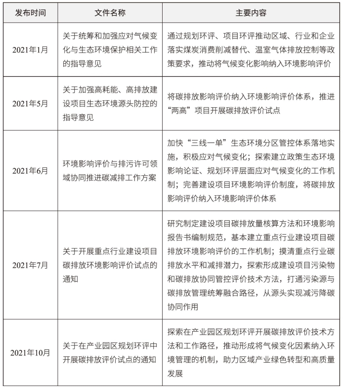 2021年1月,生态环境部印发《关于统筹和加强应对气候变化与生态环境保护相关工作的指导意见》(环综合〔2021〕4号),提出推动评价管理统筹融合,通过规划环评、项目环评推动区域、行业和企业落实煤炭消费削减替代、温室气体排放控制等政策要求,推动将气候变化影响纳入环境影响评价。2021年5月,《关于加强高耗能、高排放建设项目生态环境源头防控的指导意见》(环环评〔2021〕45号)提出,将碳排放影响评价纳入环境影响评价体系。各级生态环境部门和行政审批部门应积极推进“两高”项目环评开展试点工作,衔接落实有关区域和行业碳达峰行动方案、清洁能源替代、清洁运输、煤炭消费总量控制等政策要求。在环评工作中,统筹开展污染物和碳排放的源项识别、源强核算、减污降碳措施可行性论证及方案比选,提出协同控制最优方案。鼓励有条件的地区、企业探索实施减污降碳协同治理和碳捕集、封存、综合利用工程试点、示范。