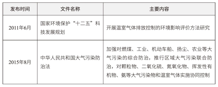 2011年6月,原环境保护部《国家环境保护“十二五”科技发展规划》在全球环境问题研究领域,制定了“温室气体排放控制的环境影响评价方法”研究计划。同年,原环境保护部部长周生贤发表文章,明确提出要“稳步实施气候与污染协同控制计划”,“开展将气候变化因素纳入环评指标体系的相关研究,考虑制定新的环评指南,将气候变化问题纳入其中”。