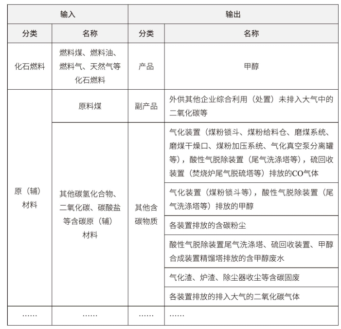 《陕西省煤化工行业建设项目碳排放环境影响评价技术指南(试行)》提出了碳源流的概念,从输入的化石燃料和原(辅)材料等一直追踪碳的流向,直到产品、副产品和废气废水固废中的其他含碳物质。碳源流类似于环评中的元素平衡,进一步细化了煤化工制甲醇生产工艺的碳产生、排放情况。陕西省煤化工行业碳源流分类情况见表4-5。