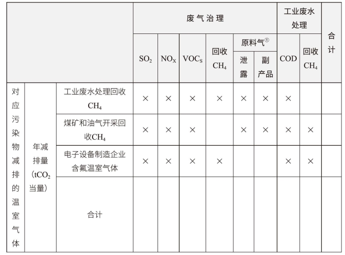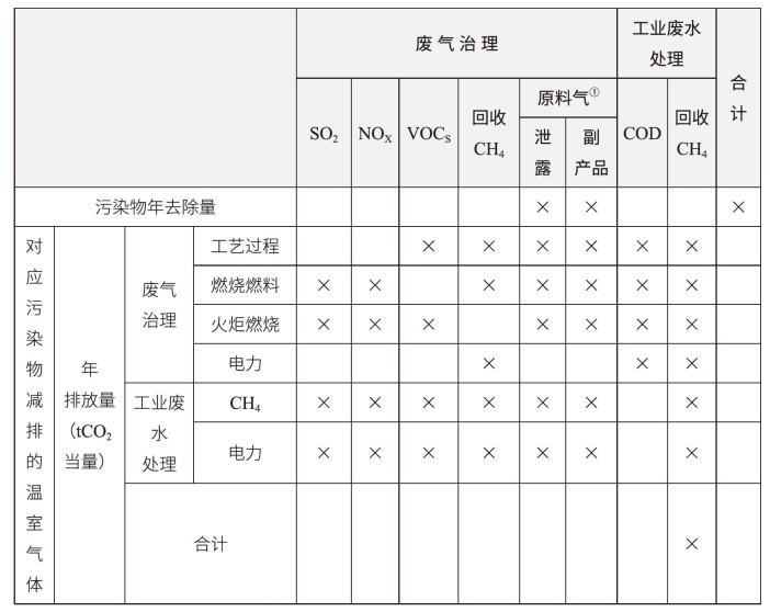 污染物去除总量应按照废气治理和废水处理分别汇总核算,《工业企业污染治理过程污染物年去除量及其温室气体年减排量汇总表》见表4-6。