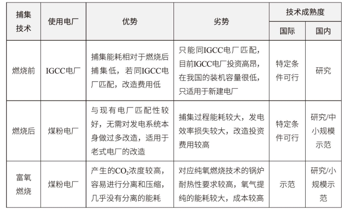 对比燃烧前、燃烧后、富氧燃烧等三种捕集方式,其技术特点对比信息见表6-1所示。燃烧前与燃烧后捕集技术国内外应用较为广泛。燃烧前捕集技术在降低能耗方面具有较大潜力,国内外许多IGCC电厂已开始使用。燃烧后捕集技术相对成熟,其中广泛采用的CO2分离方式是化学吸收法,缺点是能耗较高。我国近年来在碳捕集技术上主要围绕低能耗吸收剂选择、捕集技术工艺优化等关键技术开展研究,并取得了阶段性成果。