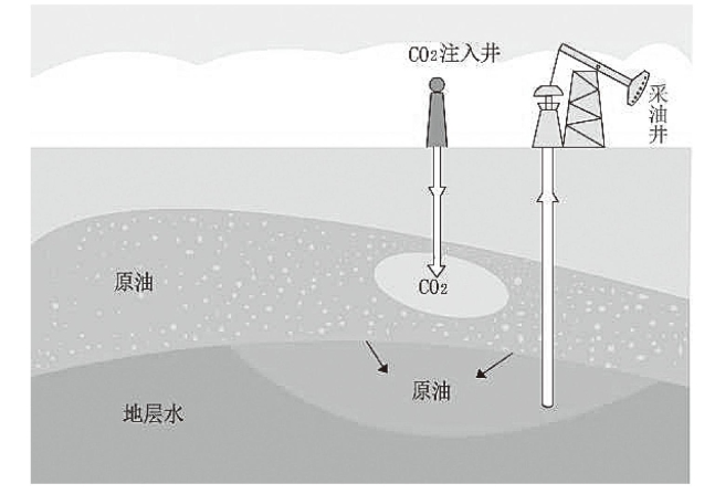 CO2强化采油技术(CO2-EOR)是通过把捕集来的CO2注入到油田中驱油,使即将枯竭的油田再次采出石油,提高原油采收率。CO2驱油技术主要有混相驱替和非混相驱替。CO2混相驱替是利用CO2将原油中的轻质组分萃取或气化,形成CO2与原油中轻质烃的混合相,从而降低界面张力,提高原油采收率;非混相驱替是把CO2溶解于原油中,降低原油粘度和界面张力,改善原油流动性,从而提高采收效率。实际工程中,非混相驱替技术的应用较少。驱油过程如图6-10所示。