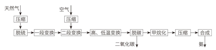 以天然气为原料的蒸汽转化法合成氨,步骤包括:脱硫—一段转换—二段转换—高低温转换—脱碳—甲烷化—压缩—合成氨,主要生产工艺流程为:天然气先经脱硫,然后通过二次转化,再分别经过一氧化碳变换、二氧化碳脱除等工序,得到的氮氢混合气,其中尚含有少量一氧化碳和二氧化碳,经甲烷化作用除去后,制得氢氮摩尔比为3的纯净气,经压缩机压缩进入氨合成回路,制得产品合成氨。合成氨工艺流程如图6-14所示。