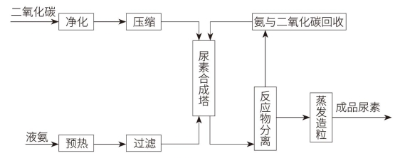 尿素是由碳、氮、氧、氢组成的有机化合物。用CO2生产尿素是CO2在化学工业利用中规模最大的应用方式,工业上采用CO2与液氨为原料生产尿素,通常将合成氨与合成尿素结合,将合成氨过程产生的CO2送入尿素生产工段,提高尿素产能。