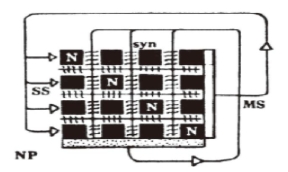在下图4-1中,左边的SS为感受器,意指所有能感受诸如色、声、香、味、触和法(意识)等的细胞,如视觉、听觉、嗅觉、味觉、触觉以及本体感觉和能感受自己意识的那些细胞。那些黑色方块中的N为神经元,在这里未显示神经元的其他特性,为高度简化的形式。右边的MS为效应器,在这里传出神经和效应器合二为一特称为效应器,意即其任何一种动作,包括眨眼、说话等都是效应器的活动,但这一动作并非狭义意义上的效应器完成的,所以在图的右边有向上的三角形,那是一个运算的放大器,其输出复回到感受器SS上。这一部分的生物学意义不容忽视,亦即在进化过程中,人类或者其他动物在漫长的岁月中不停地与环境保持互动,起始时那些与生存息息相关的环境的有些信息明确地被刻画在神经系统中,其意义通过放大效应复作用到感受器的感觉细胞。简而言之,我们要做一个动作时,这个动作的效果总会回到我们相应的感受器细胞上。我们总是会意识到这些动作将要发生,并懂得这些动作对我们自己的意义以及由它所导致的后果。这一过程是封闭的,信息在其中不停地流动,为动作的模式化提供条件,意义的萌动由此开始,但还需要另一个闭合环路的参与。