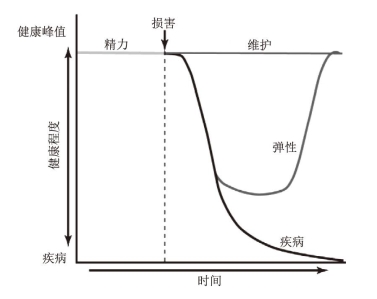 如图5-1所示,在日常生活中人的寿命是有限的,因此,随着时间的推移,人的健康状况会出现变化,更不用说对健康有害的损害因素作用到身体。其实时间本身就是一种损伤因素,世上没有一个人永葆青春,这与自组织中各器官系统本身的损耗紧密相关。假如损害因素作用到身体时,无论这种损害何时出现,个体健康状况面临挑战,这一进程到达第一次交叉路口,即要么进一步坚持维护原来具有的精力状态,要么健康出现下滑,机体逐渐失去精力或活力。如果想维护活力状态,所受到的损害应该很小,该损害不足以对机体产生很大的伤害,机体能够调动本身固有的恢复能力,以期对抗损害;而当机体无法维护健康的时候,随着时间的推移,健康状况变得恶化起来。这时,健康的进程又走到下一个关键时刻,即在机体弹性能力不足的情况下健康的身体必将走向疾病,但是,我们常常看到在有限的时间里身体从疾病中得到恢复,从而继续维持健康,这是我们希望看到的。