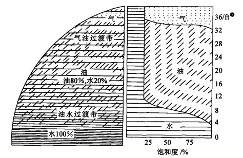 任一油气藏或油藏中都存在石油、天然气、油田水三种流体,只有纯气藏中才只有天然气和油田水。这些流体存在于储集层的孔隙裂缝中,并在圈闭范围内按比重分异,在垂向上呈层状分布,天然气最轻居圈闭顶部,石油居中,水在下面。同时,油气藏中的油、气、水三者存在过渡带,并以一定关系共存于储集层的孔隙系统中(图2-1)。因而,油气藏中的油、气、水是相互关联又各自独立存在的流体。