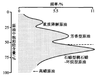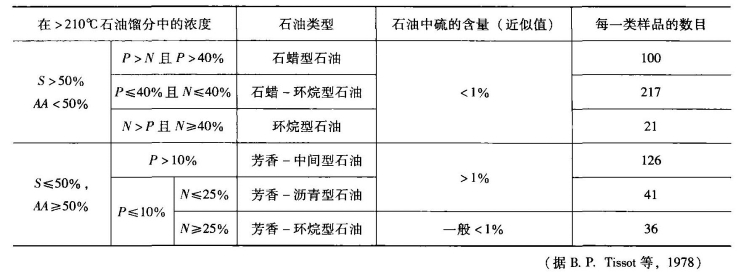 石油的分类常因用途不同而采用的参数各异。石油化学家侧重于各馏分含量及其化学组成和物理性质,地球化学家和地质学家则注意原油组成与生油岩及其演化作用的关系。后者有代表性的分类方案是Tissot和Welte(1978)提出的,该分类主要依据石油中各种结构类型烃类化合物:烷烃(石蜡)、环烷烃、芳香烃和含硫、氮、氧化合物(胶质和沥青质)的含量,也考虑硫的含量。
