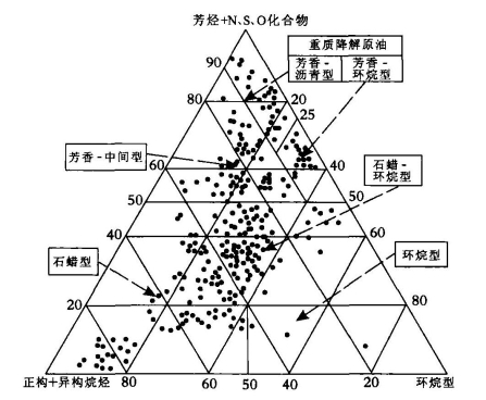 该分类主要是依据原油中各烃类的含量比例关系,以烷烃(石蜡),环烷烃,芳烃+S、N、O化合物三个参数作为三个端员,采用三角图解来划分原油类型。注意该方案中所用参数是原油中沸点>210℃馏分的分析数据。