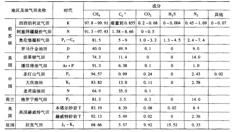 表2-7 世界上若干地区和油气田中天然气成分简表