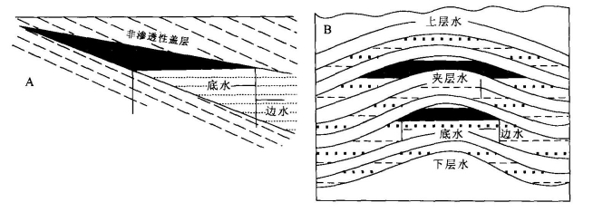 在油气田范围内的非油(气)层水,可根据它们与油(气)层的相对位置,分别称为上层水、夹层水和下层水。油气田范围内水与油气分布的关系,如图2-16B所示。