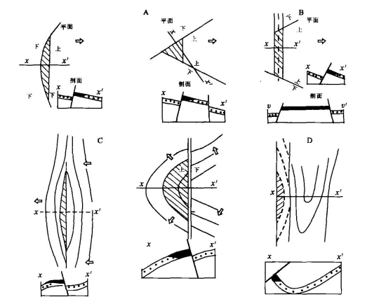 断层圈闭的形式是多种多样的,但在成因上它们又有着内在的联系,最基本的共同点,就是它们都是在储集层的上倾方向为断层所封闭。根据断层圈闭的形成条件和形态特征,断层圈闭和油气藏可分为以下四种基本类型:①弯曲或交错断层与单斜地层结合形成的断层或断块圈闭和油气藏(图4-14 A);②三个或更多断层与单斜或弯曲地层结合形成的断层或断块圈闭和油气藏(图4-14 B);③单一断层与褶皱(或背斜一部分)结合形成的断层或断块圈闭和油气藏(图4-14 C);④逆断层和逆掩断层与背斜的一部分结合形成的断层圈闭和油气藏(图4-14 D)。