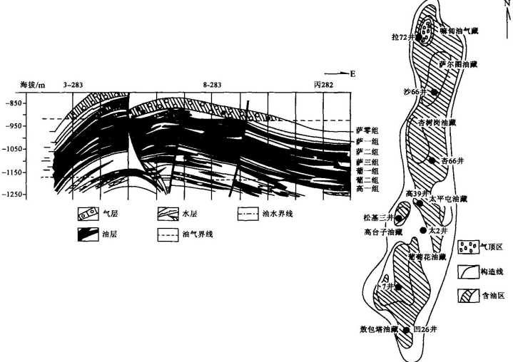 图4-11 大庆油田构造图及油藏剖面示意图(据大庆油田,1977)