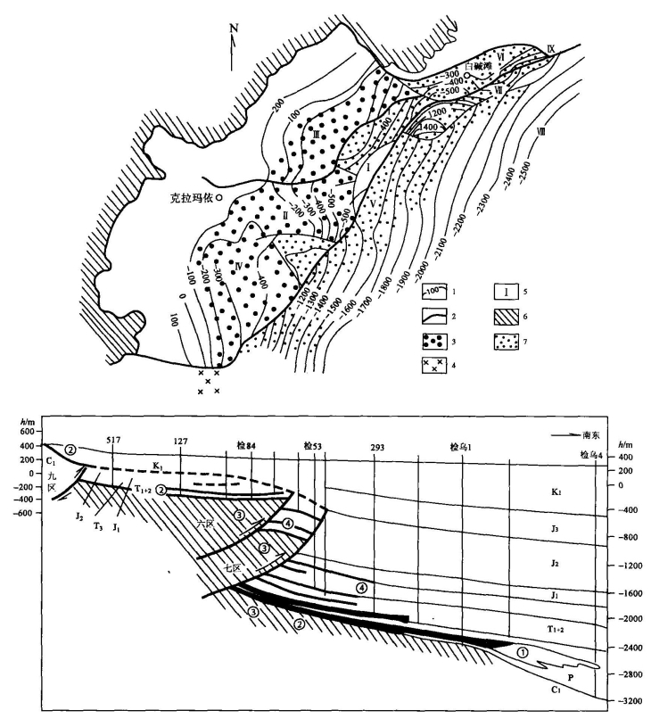 图4-15 克拉玛依油田平面及剖面图(转引自陈荣书,1994)