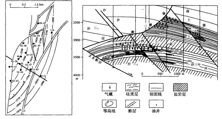 图4-16 东濮凹陷文92块油气藏平面及剖面图(据中原油田,1987)