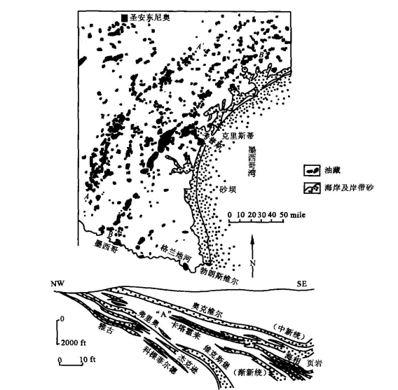 图4-29 美国得克萨斯州南部墨西哥湾沿岸地区始新统雅古·杰克逊砂岩和渐新统弗里奥·维克斯堡砂岩上倾尖灭油气藏(据Dussen & Owen,1939)
