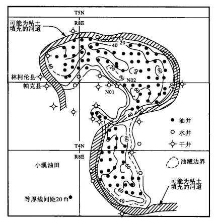 美国密西西比州林柯伦县和帕克县的小溪油田(图4-25)为典型的边滩砂岩体油气藏。砂岩厚度与蛇曲凹岸一侧延伸方向一致,砂体的形态与边滩一致。该油田构造为一向北倾斜的鼻状构造,油田分布主要受边滩砂岩体控制。油田面积约25km2,原始可采储量达1370×104t。