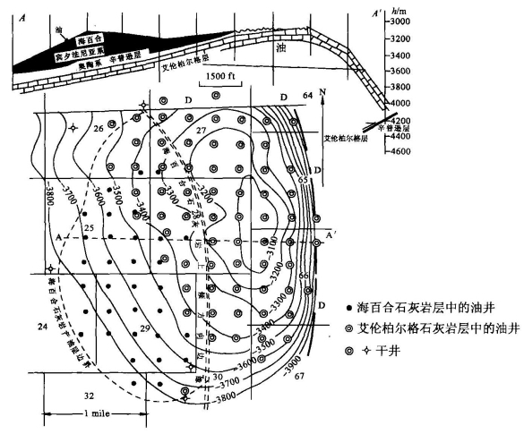 图4-27 美国托德穹窿西翼的高产“海百合灰岩”沉积-透镜型油藏图(据Imbt,1950)