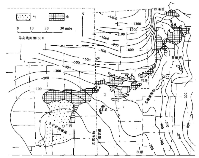 在碳酸盐岩中同样也存在上倾尖灭型岩性油气藏。如美国胡果顿气田(图4-30)就是这类油气藏的典型实例之一。它占有堪萨斯州的九个县及俄克拉荷马州的一部分,向南直到得克萨斯州北部,南北延伸约240~260km,东西宽约50~80km,含气面积达15500km2,原始储量为2.039×109m3,为世界第八大气田,是美国最大的气田。
