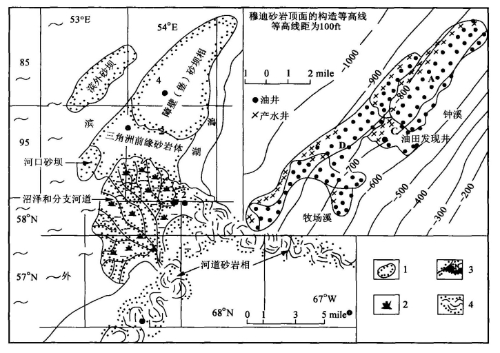 三角洲砂岩体以三角洲平原的分流河道砂岩体和三角洲前缘的河口坝砂岩体最为重要。美国蒙大拿州南部钟溪油田穆迪砂岩中的油气藏,就是由堡坝和河口坝砂岩体复合而形成的透镜型岩性油气藏的典型实例。根据对油田及其附近地区穆迪砂岩(主要产油层)的岩相古地理研究表明(图4-26),穆迪砂岩为一北东—南西向的堡砂坝,厚约30m。堡坝与海岸之间有潟湖相隔。该砂坝西南为纽斯卡河的河口坝和三角洲前缘砂坝,它们是牧场溪油田的主要储集体。据钟溪(包括牧场溪)油田构造图及砂岩体和油藏分布图可知,该区为一均斜构造,油藏分布与构造没有明显关系,而完全受砂岩体分布范围控制,各个砂岩体都是一个独立的油气聚集单位,都有各自的油水边界。