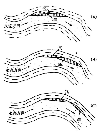 在水动力作用下,油、气的力场强度,应是净浮力和水动力的合力。因此,油、气等势面(垂直油气力场强度)的方向也相应改变,向水的力场强度方向倾斜(即油水界面向力场强度方向倾斜),油、气等势面与储集层顶面构造等高线就不相平行。在这种情况下,倾斜或弯曲的等油气势面可以使静水条件下不存在圈闭的部位,形成新的油气圈闭。其闭合区可由闭合的等油气势线圈定。