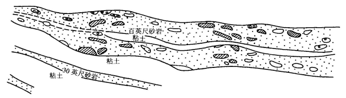 这种油气藏的圈闭是由单一的水动力封闭所形成。美国阿帕拉契亚百英尺砂岩中的透镜型砂岩体圈闭可能属于这一类型。该层为一巨厚砂岩(百英尺砂岩),由于岩性不均一,形成局部高孔隙、渗透性透镜体,水在其中流动时速度不均一,造成等势面弯曲,使其中高渗透性透镜状砂体完全被高势面所封闭形成圈闭,油气产于这种高渗透砂体中(图4-45)。