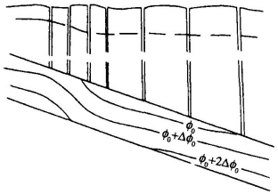对于单斜岩层来说,沿倾斜方向的渗透性常有变化。水沿储集层向下倾方向流动时,通过渗透性不同的地段,流速会发生相应的变化,从而使等势面的斜度发生改变。在渗透性差的地段,水流速度加快(在单位时间通过流量不变的条件下),等势面的倾斜度变陡;而在渗透性较好的地段,流速慢,等势面倾斜度缓。这样在渗透性较低、等势面变陡的地段,可以在储集层顶面造成闭合的油气低势区,即圈闭(图4-44)。