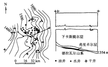 这种构造在静水条件下不闭合,不能形成圈闭。但在向储集层下倾方向的流水作用下,油水(气水)界面发生水流方向倾斜或弯曲,且满足α1<θHC/w<α2时,就会在构造鼻或阶地的倾角变化处(α1为低倾角、α2为高倾角)形成闭合的油气低势区(图4-42)。美国得克萨斯州的韦特油田(图4-43)可以作为该类油气藏的实例。