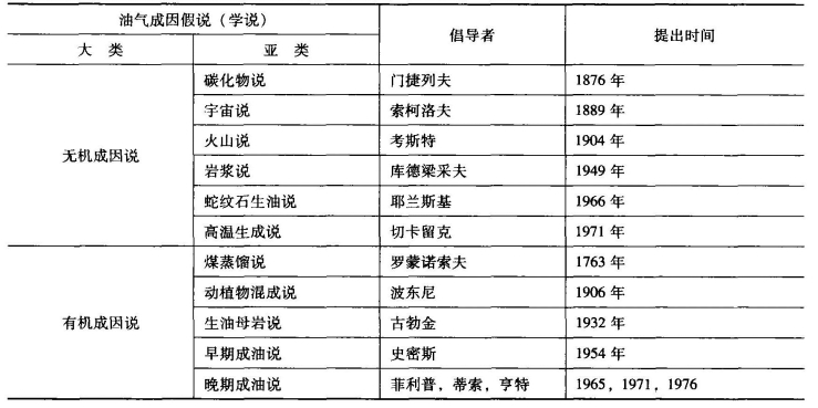 由于油气的可流动性、成分的复杂性及其起源物质与油气之间的过渡形式难以追寻,导致油气的成因长期争论不休。不同学者基于各自对起源物质和油气生成理化过程的理解,提出了各种不同的油气成因假说。众说纷纭的油气成因争论,主要表现为有机起源与无机起源两大派别的对垒。有机与无机学派相比较而存在,相斗争而发展;无机学派在19世纪占上风,有机学派在20世纪以来占上风,有机学派中早期成油说是成油理论的基础,而晚期成油说使成油理论日趋完善(表5-1)。