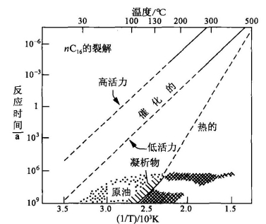 图5-20 正十六烷热裂解和催化裂解所需要的时间(据Goldstein,1980)
