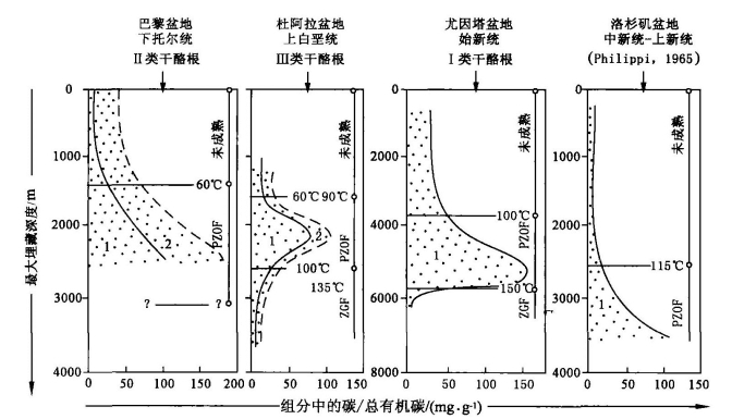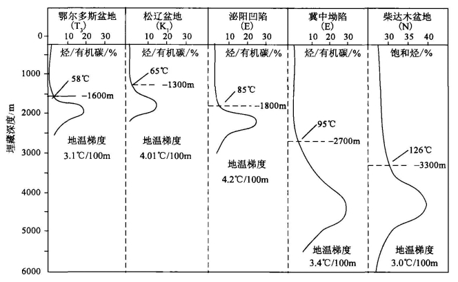 图5-18 中国若干盆地不同世代烃源岩埋深与油气生成关系图(据黄第藩,1991)
