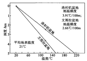 图5-16 洛杉矶盆地和文图拉盆地平均地温梯度(据Philippi,1965)