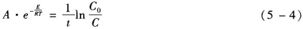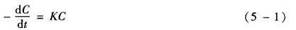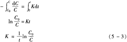 反应速率常数(K)与时间的关系可用式(5-1)积分得到。以C0和C分别代表反应物原始浓度和t时间反应物的浓度,将式(5-1)移项定积分则: