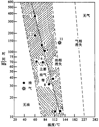 从图5-19可看出,沉积有机质的时代越新即所经历的受热时间越短,则生油门限温度越高;时代越老受热时间越长,则门限温度越低。图中的时-温线的斜率是由活化能决定的。图中的虚线是据镜质体反射率提供的信息加上的,虚线给出了油气生成过程开始与结束的界限。地温达不到门限值,无工业石油生成,温度超过油相或气相消失界线,则油气被破坏。因此,基于温度和时间的综合作用,有利于生烃并保存的盆地应该是年轻的热盆和古老的冷盆。