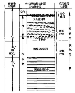 图5-27 富含有机质的敞开海沉积物中微生物代谢作用的生化环境剖面图(据Rice & Claypool,1981)