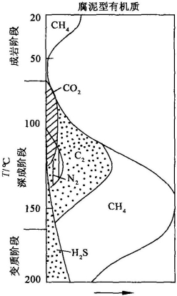 腐殖有机质的基本结构是带有许多脂肪族短侧链和杂原子官能团的缩合稠环芳烃体系。稠环有较大的稳定性,但侧链和官能团与稠环之间的结合力较弱,热稳定性小,故在不断埋藏和升温过程中逐渐发生脱落,分解形成CO2、H2O、N2、CH4及其同系物等分子简单的挥发物质。