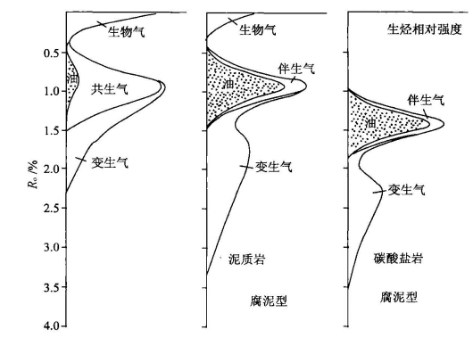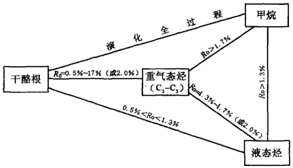 油型气指成油有机质(腐泥型和混合型干酪根)在热力作用下以及石油热裂解形成的各种天然气,主要包括石油伴生气、凝析油伴生气和热裂解干气。成油有机质的热演化成烃过程用Ro来表示其阶段和主要产物(图5-28)。