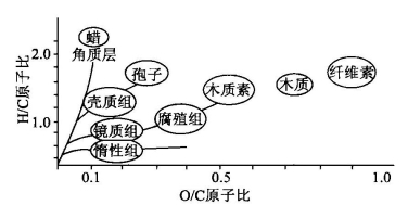 腐殖煤及腐殖型干酪根显微镜下观察有3组煤岩显微组成,即镜质组、惰质组和壳质组。镜质组是最主要的组成,它是植物茎、叶等木质纤维组织通过分解和凝胶化作用而形成的,有结构镜质组和无结构镜质组。惰质组又称丝质组,是木质纤维被焚烧或经脱水强氧化后而形成,具丝炭状细胞结构。壳质组也称稳定组,包括孢粉、树脂体、角质体和木栓体等,它们常具清晰的特殊形态和光学性质。上述3种煤岩组分中,挥发分含量以壳质组最多,其次为镜质组,再次为惰质组。壳质组在成煤所有阶段均有烃类生成,镜质组仅从气煤-肥煤阶段才开始生烃,而惰质组则从贫煤(Ro>1.9%)阶段才产生甲烷。3种煤岩组分和几种植物组成的元素分析见图5-30。