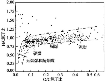 成煤作用的阶段可划分为泥炭化作用和煤化作用两大阶段,前者指高等植物主要在生物化学作用下转变成泥炭的过程。后者又分为成岩作用和变质作用阶段,成岩作用阶段是从泥炭到褐煤的过程,而变质作用阶段主要是在热力作用下由褐煤依次转变为长焰煤、气煤、肥煤、焦煤、瘦煤和贫煤等烟煤至无烟煤的过程。从泥炭到无烟煤的元素组成如图5-31所示。