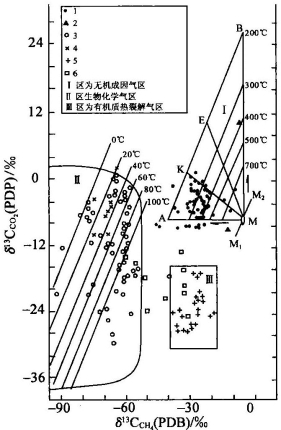 图5-33 自然界CH4与CO2共生体系的δ13CCH4和δ13CCO2分布图(据Гуцало,1981)
