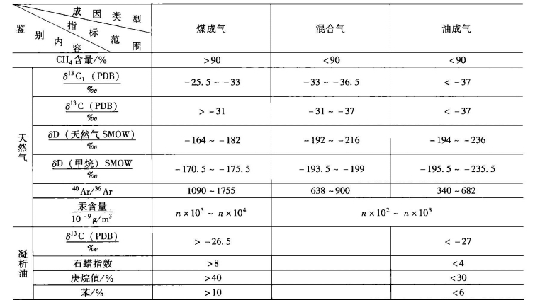 表5-9 不同成因天然气的各种地球化学判别指标综合表