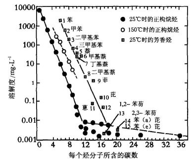 图6-14 烃在水中的溶解度与碳数的关系图(据McAuliffe等,1963-1978)
